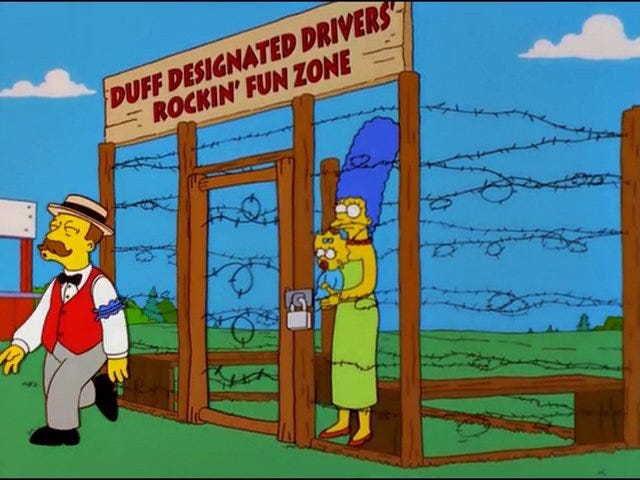 As I got older, my parents began to relax a little and give me more leeway. I’ll never forget the night my dad and I discovered that The Simpsons was funny, actually, and not, as we understood it, my mother’s worst nightmare. I remember the exact joke that got my dad, like a duck pranged out of the sky: the Simpsons went to a beer festival (“Duff Days: A Lost Weekend for the Whole Family!”), and before walking in the ticket counter asked which one of them was the designated driver. Marge raised her hand, and she was immediately led into a makeshift jail dressed in barbed wire. Things were never the same for my dad, and we made up for lost time via reruns and syndication.